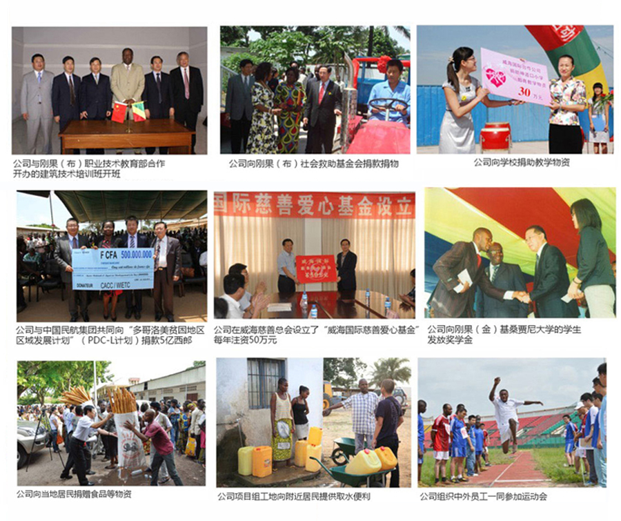 公司積極參加各種公益慈善活動。在國內(nèi),公司通過捐款捐物、設(shè)立獎學(xué)金以及捐建設(shè)施等方式長期資助神道口小學(xué)及中學(xué)、山東建筑大學(xué)、威海兒童福利院,支持社區(qū)發(fā)展;在威海市慈善總會設(shè)立“威海國際愛心基金”,每年至少捐資50萬元,是市慈善總會設(shè)立的所有冠名基金中最大的一個。在國外,向各類社會救助機構(gòu)、學(xué)校、國家運動隊等提供長期資助;發(fā)生自然災(zāi)害或社會危難時,公司竭盡所能,參與救助;在國外利用施工力量,為當(dāng)?shù)鼐用裥迯?fù)道路,提供水、電便利,為政府捐建公共設(shè)施,等等。作為公司的一項制度,境外各屬地公司每年都要提出符合當(dāng)?shù)貙嶋H的履行社會責(zé)任計劃清單,確定不同主題的關(guān)愛捐獻(xiàn)活動。目前,公司在慈善公益方面的投入已達(dá)數(shù)千萬元人民幣。