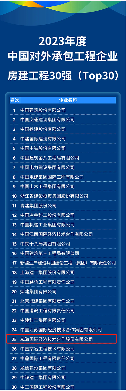 On May 7, during the 2024 China International Contracting Conference & Development Forum, China International Contractors Association released several rankings of China’s international contracting enterprises in 2023. Weihai International Economic & Technical Cooperative Co., Ltd (WIETC) was successfully listed among the Top 100 International Contracting Enterprises, the Top 30 Housing Construction Enterprises and the Top 30 Enterprises for Africa Business, ranking 65th, 25th and 25th respectively, which once again reflects the company's growing strength in overseas development.China's top 100 international contracting enterprises