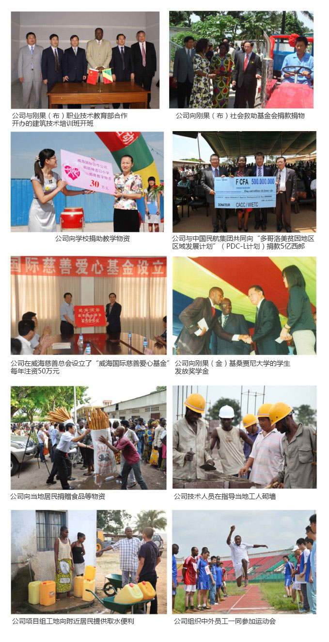 La société réagit activement au travail charitable: en Chine elle soutient pendant longtemps l'école primaire et collège de Shendaokou à Weihai, the Shandong Jianzhu University, la Maison des Enfants de Weihai, le développement communautaire, à travers la donation de fond et des articles, l'offre des bourses et des installations etc. Elle établit la Fondation Internationale de Coeur à l'institut général philanthropique de Weihai, fondation la plus importante parmi toutes celles titrées dans cet établissement, y met 500 milles RMB de somme annuelle minimale. A l'étranger, elle finance pendant longtemps de différents organismes de secours, des écoles, des équipes nationales, en particulier fait tout son possible pour assister aux aides au cas des catastrophes et movements sociaux. Elle a prêté des moyens à la réparation des routes pour peuple local, à l'approvisionnement de l'eau et d'électricité, à la construction des infrastructures municipales etc. Les succursales locales devant chaque année déclairer la liste et le planning de s'acquitter à la responsabilité sociale et compatible à la réalité locale en définissant les différentes actions de soin est notre régime. La somme totale investie par WIETC dans les activités charitables a dépassé 10 millions RMB.