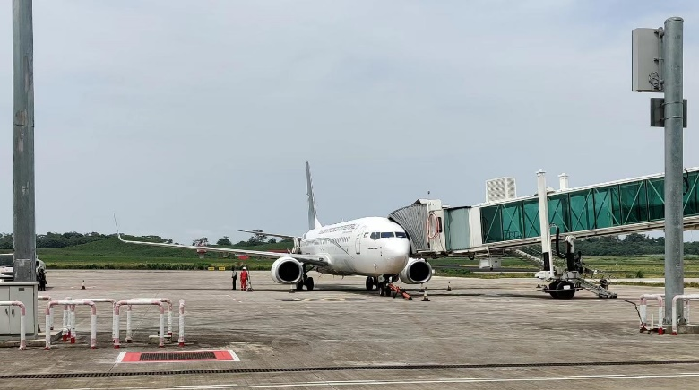L'avion s'est garé favorablement sur l'aire de stationnement de l'Aéroport international de Malabo
