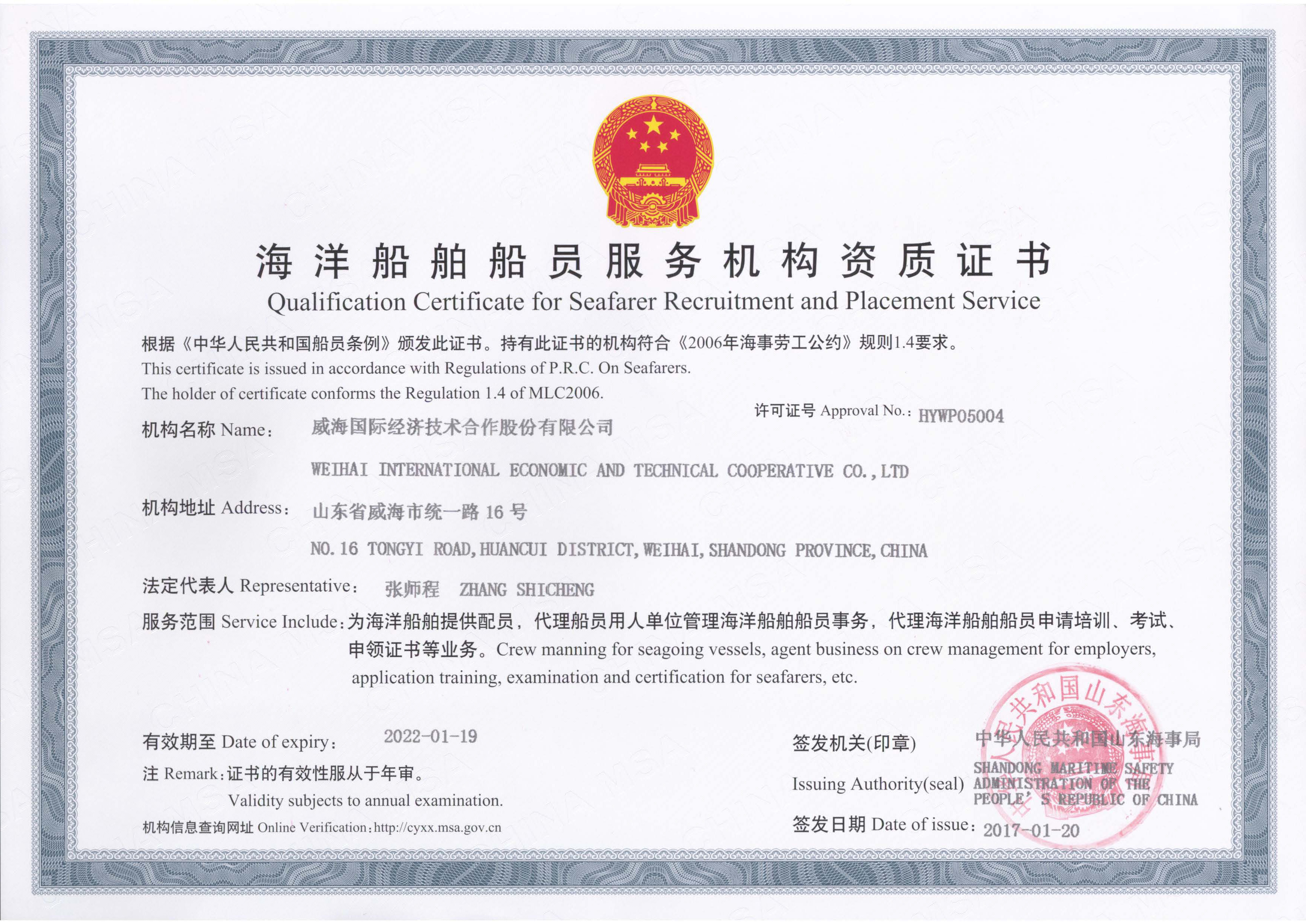 海洋船舶乗組員サービス機(jī)構(gòu)資格証