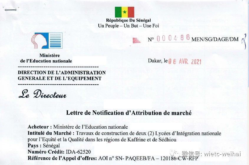 このごろ、當(dāng)社セネガル正威會(huì)社はセネガル教育省からの『セディウ國立高等學(xué)校プロジェクト落札者決定通知書』を受け取った。當(dāng)該プロジェクトは首都ダカールから385キロ離れるセネガル南部のセディウ州に位置していて、教室、學(xué)生寮、図書館、食堂、教職員寮、総務(wù)棟など20以上の建築物と屋外工事から構(gòu)成され、総建築面積が16800平方メートルで、契約額が千萬ドルを超えている。