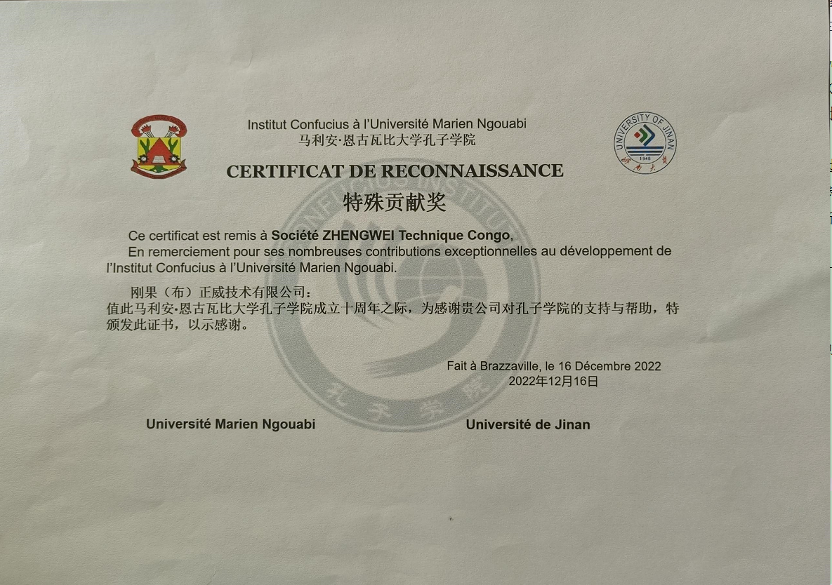 12月16日、コンゴ共和國(guó)ANGOUABI大學(xué)孔子學(xué)院は創(chuàng)立10周年祝賀式典を開催。コンゴ共和國(guó)正威會(huì)社は招待されて出席し、「特別貢獻(xiàn)賞」を受賞。コンゴ共和國(guó)教育部長(zhǎng)アドゥキ氏、中國(guó)駐コンゴ共和國(guó)大使の馬福林大使、ANGOUABI大學(xué)総長(zhǎng)のオンゾト氏が出席し、祝辭を述べた。