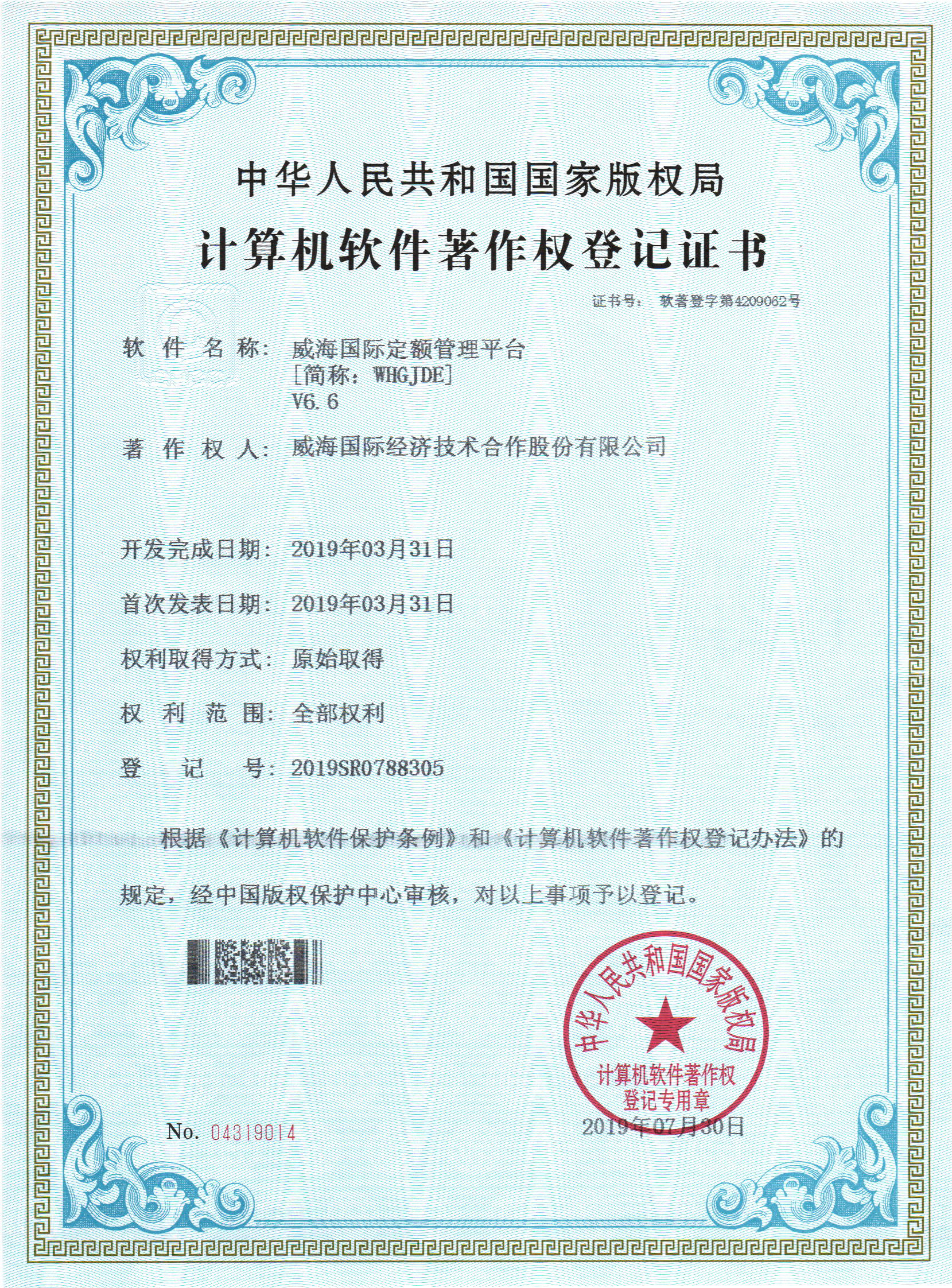 近日,威海國(guó)際企業(yè)定額管理平臺(tái)喜獲中華人民共和國(guó)版權(quán)局計(jì)算機(jī)軟件著作權(quán)登記證書》(證書號(hào)軟著登字第4209062號(hào))。